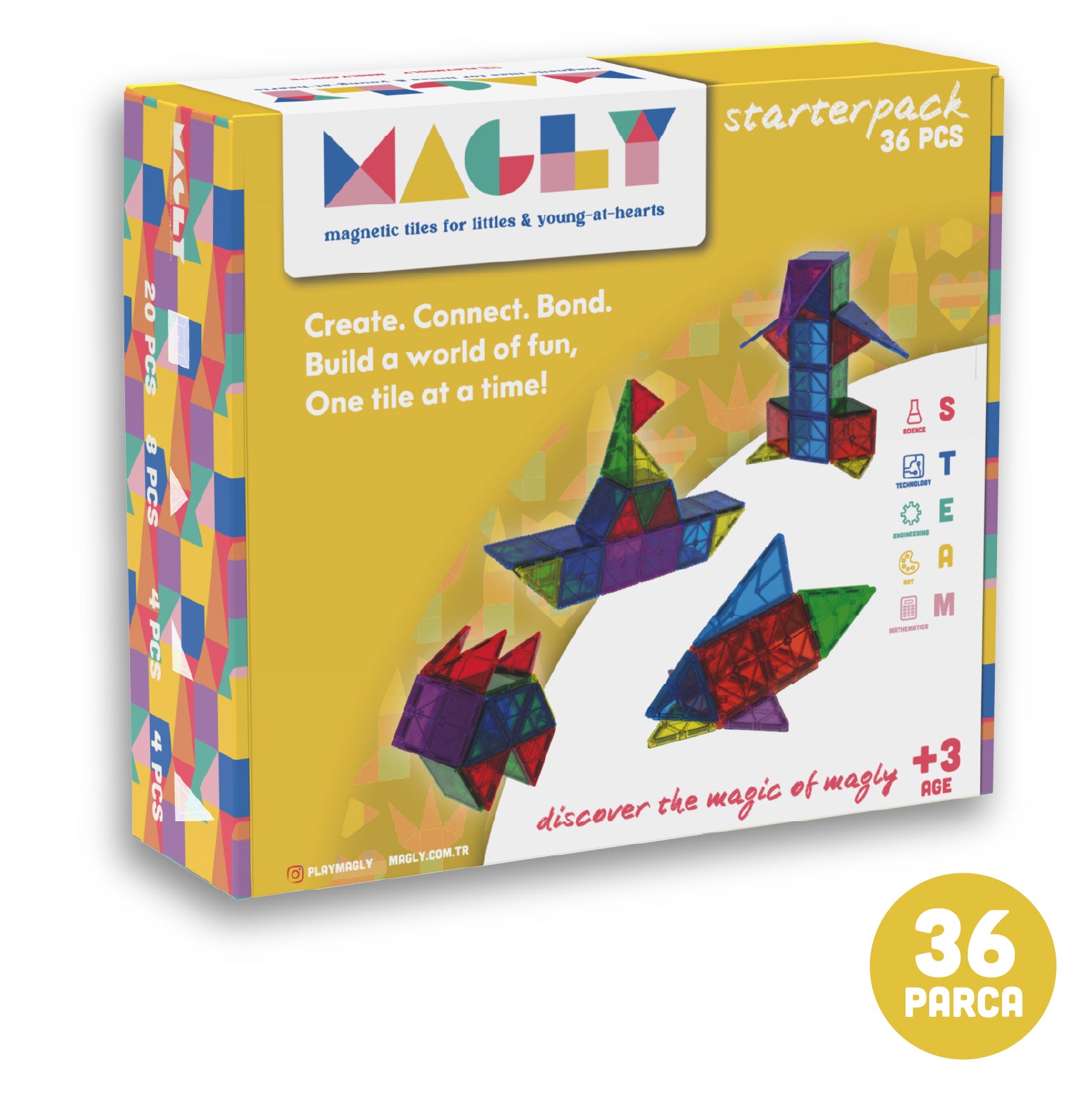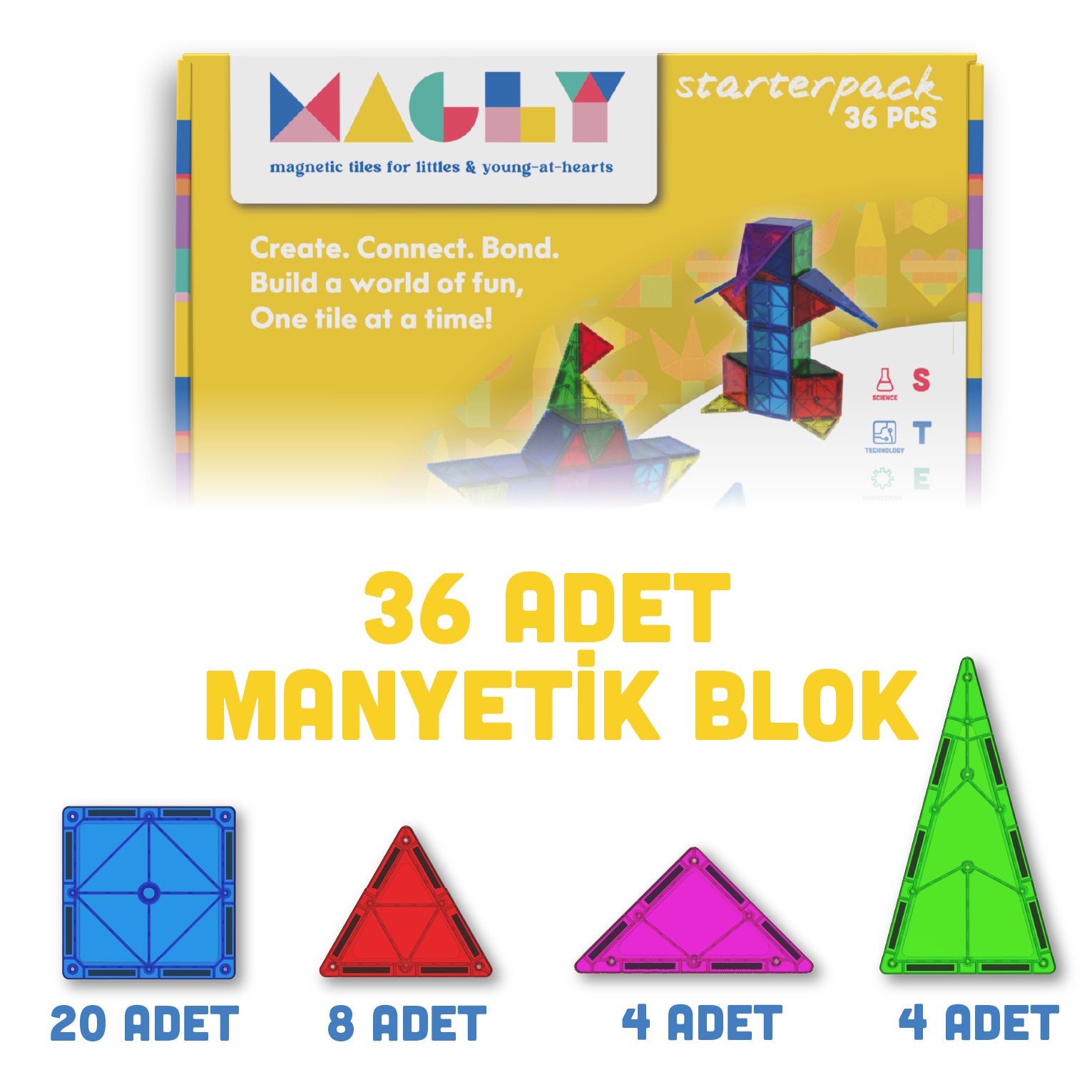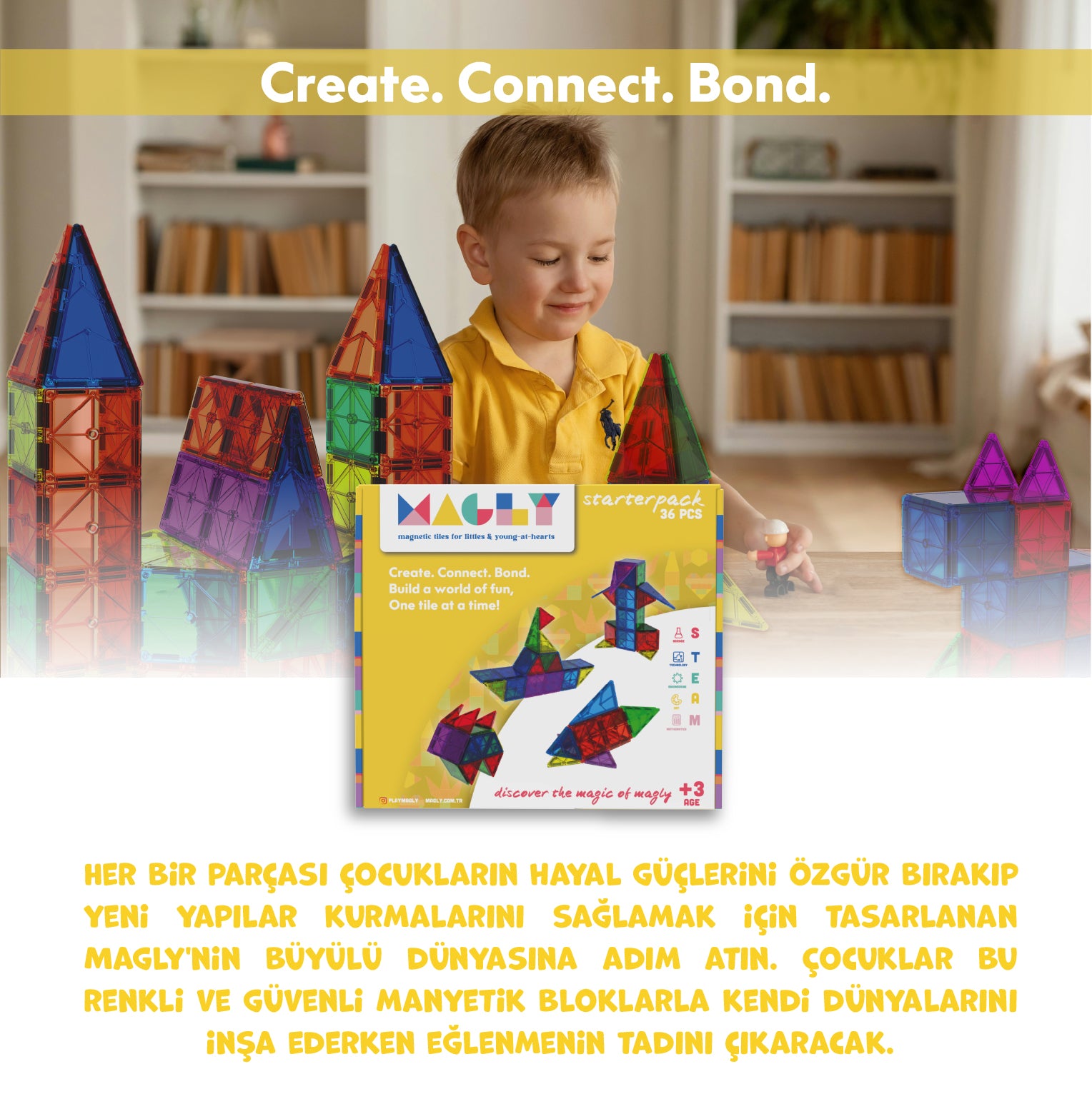 Create. Connect. Bond. Her bir parçası çocukların hayal güçlerini özgür bırakıp yeni yapılar kurmalarını sağlamak için tasarlanan Magly'nin büyülü dünyasına adım atın. Çocuklar bu renkli ve güvenli manyetik bloklarla kendi dünyalarını inşa ederken eğlenmenin tadını çıkaracak.