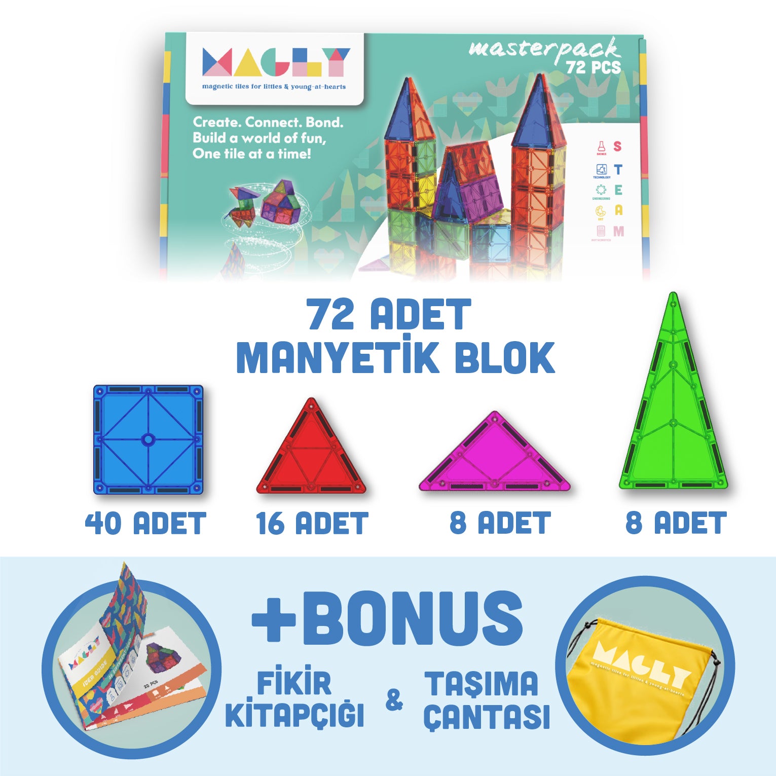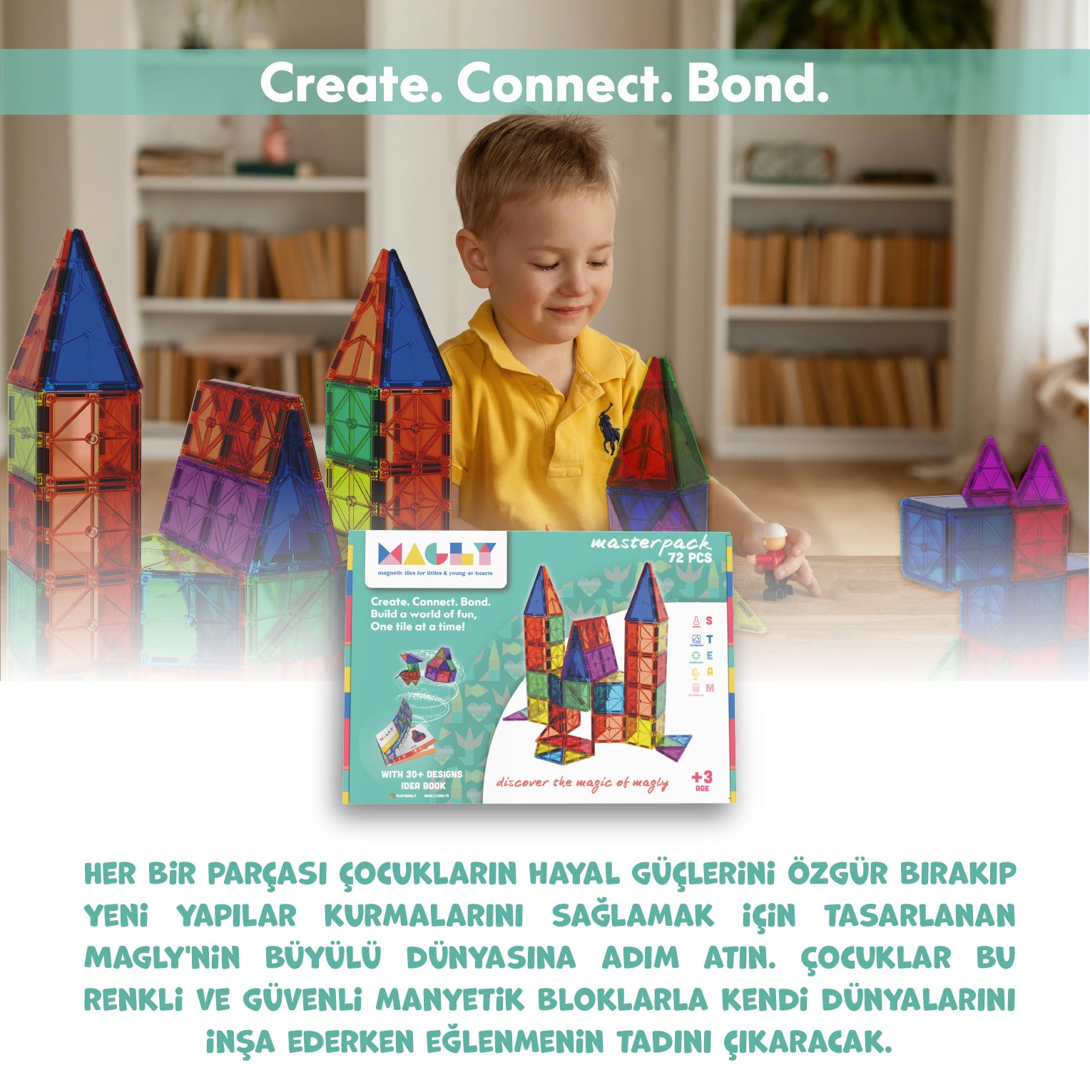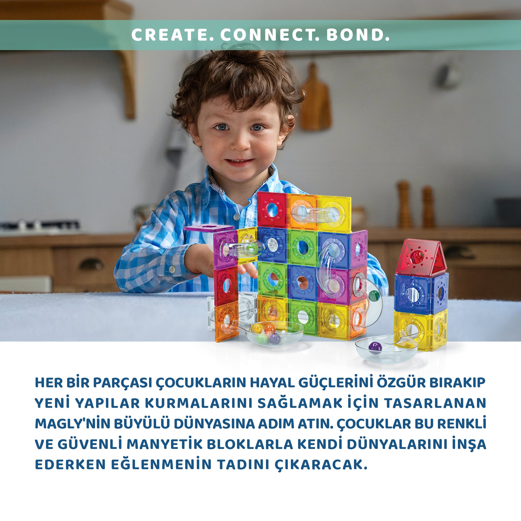 Create. Connect. Bond. Her bir parçası çocukların hayal güçlerini özgür bırakıp yeni yapılar kurmalarını sağlamak için tasarlanan Magly'nin büyülü dünyasına adım atın. Çocuklar bu renkli ve güvenli manyetik bloklarla kendi dünyalarını inşa ederken eğlenmenin tadını çıkaracak.